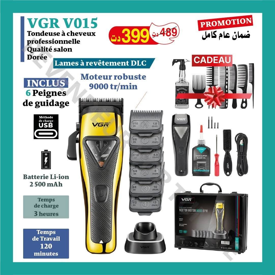 tondeuse à cheveux professionnelle VGR V-015 de qualité salon est un outil de coiffure polyvalent et puissant, conçu pour un usage en salon et personnel. Dotée d’un corps en métal robuste et de lames à revêtement DLC, elle garantit une coupe précise et nette à chaque fois. Dotée d’une puissante batterie lithium de 2 500 mAh offrant 120 minutes d’autonomie après seulement 3 heures de charge, cette tondeuse est idéale pour un toilettage efficace. Son moteur vectoriel de 9 000 tr/min offre des performances exceptionnelles, tandis que les six peignes de guidage magnétiques permettent des longueurs de coupe personnalisables de 0,8 mm à 13 mm. Sa conception ergonomique assure une prise en main confortable et la tondeuse est facile à nettoyer et à entretenir. Un moteur silencieux, un changement de vitesse intelligent et une recharge USB Type-C ajoutent à son confort. Avec une garantie d’un an et un service client de qualité, la VGR V-015 est l’outil idéal pour des coupes de cheveux de qualité professionnelle.