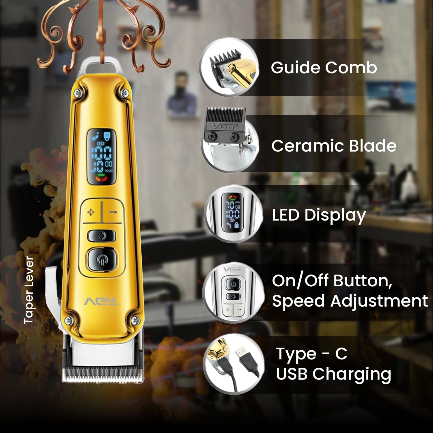Cette tondeuse à cheveux VGR V-006 est fabriquée en céramique et en métallurgie des poudres de type U, spécialement conçue pour votre peau délicate. Le corps de la tondeuse est composé de métal de qualité supérieure. L’ensemble de tondeuse à cheveux est livré avec 8 peignes de guidage de coupe réglables avec un câble de charge de type C, une brosse de nettoyage et une bouteille d’huile. Vous pouvez régler la longueur jusqu’à un maximum de 19 mm. Vous pouvez donc facilement régler la longueur souhaitée de la coupe de 1 mm à 19 mm. Cette tondeuse a un RPM réglable de 5500-6000-6500-7000 (bouton de contrôle de la vitesse) et dispose également d’un rappel de verrouillage de voyage qui vous offre une protection parfaite contre les démarrages inattendus lors d’un voyage (appuyez longuement sur le bouton ON/OFF pendant 3 secondes pour activer/désactiver la fonction de verrouillage de voyage).